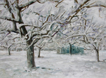 2018De eerste sneeuw van deze winter. Warme laarzen aan, muts op en eruit. De boomgaard, de Hordenboomgaard, is helemaal wit, wel met verschillende tinten groen, grijs en paars.