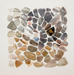 2016Een compositie van stukjes schelp, steentjes, een vuursteentje en een stukje porselein, misschien wel uit het verre oosten. En wat ik mooi vind om te weten: "De meeste schelpen die we op het strand vinden, zijn min of meer fossiel, duizenden, vaak tienduizenden jaren oud" p. 39 uit Texel, in het voetspoor van Jac.P. Thijsse, van Toon Fey.
