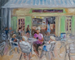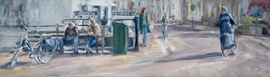 2019Veel contrast tussen de zon- en schaduwdelen van de kerk. De takken van de grote boom op het plein zorgen voor een lijnenspel tegen de muren. En het ging me ook om het schilderen van de fietsen, met de blauwe fietstas er tussenin. Het is op een zondagochtend in Wijk bij Duurstede.